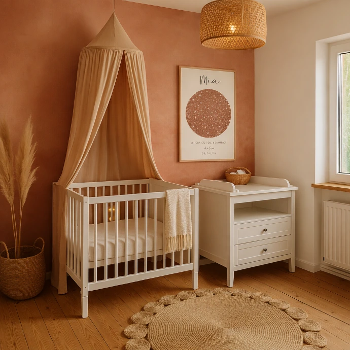 Cartes du ciel de naissance, illustrations sur mesure, décorations murales… Des objets doux et intemporels pour raconter leur histoire dès les premiers jours.