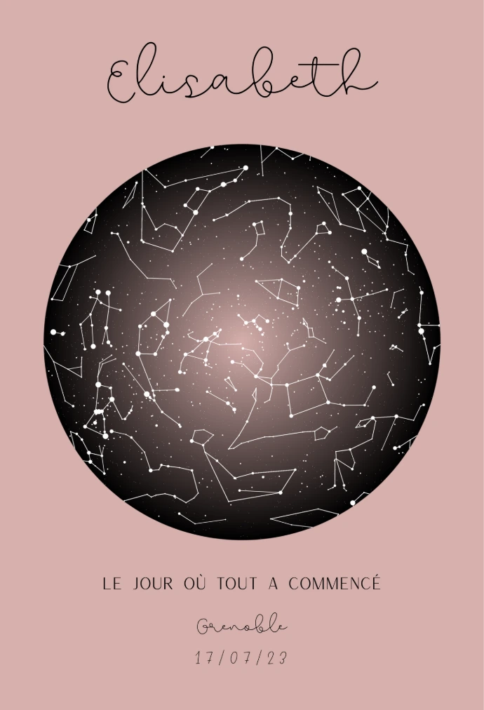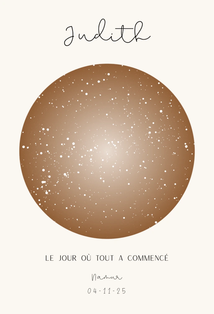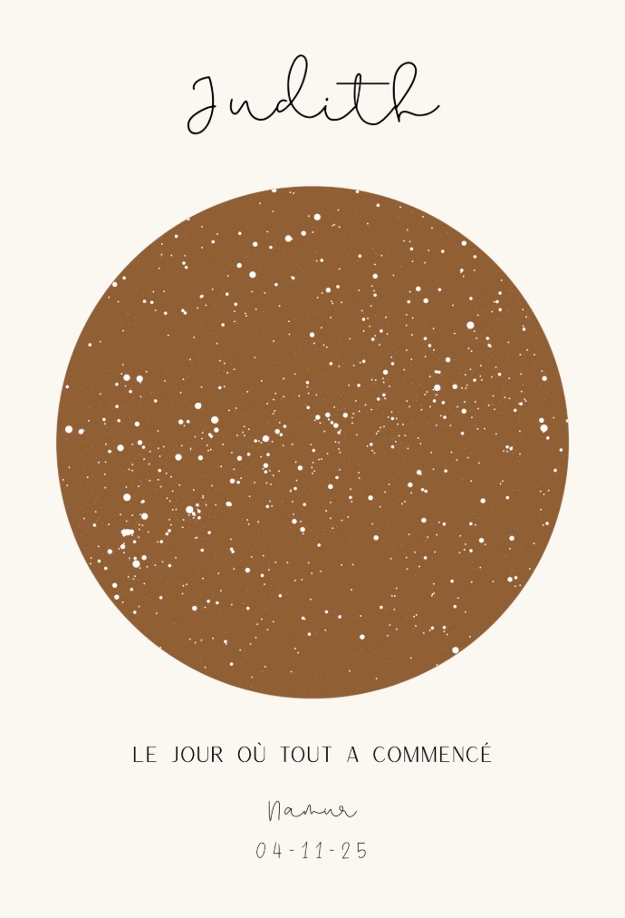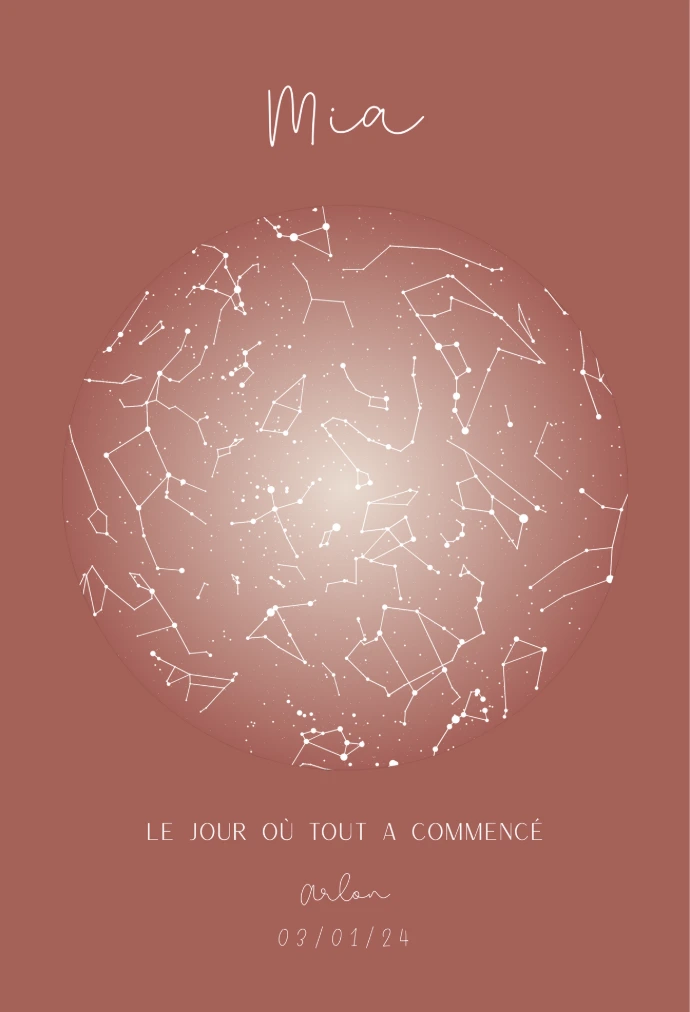 Grâce à la date, l’heure et le lieu de naissance, nous recréons la carte du ciel unique de cet instant magique. Les étoiles et constellations sont positionnées exactement comme elles l’étaient ce jour-là, pour créer un souvenir aussi personnel qu’intemporel.